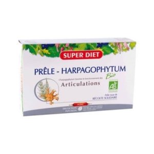 Le complément alimentaire Prêle Harpagophytum Bio de Super Diet favorise le bon fonctionnement des articulations en soulageant les douleurs, Caractéristiques La prêle est associé à l’harpagophytum pour optimiser l’action bénéfique au niveau des douleurs articulaires, Certifié bio, ce complément alimentaire est sans alcool, sans colorant et sans conservateur, Conseils dutilisation A consommer dans un demi verre d’eau à raison d’une ampoule par jour, de préférence le matin, compte tenu des biorythmes de l’organisme, Précautions demploi Déconseillé aux femmes enceintes et allaitantes, Il est recommandé de respecter les doses conseillées, de veiller à avoir une alimentation variée et équilibrée et un mode de vie sain, Tenir hors de portée des jeunes enfants,