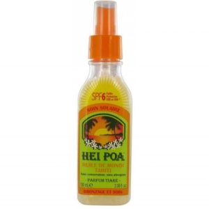 Faible protection, l’Huile de Monoï SPF6 protège efficacement la peau des rayons du soleil (UVA et UVB), Enrichie en Monoï de Tahiti, cette huile sèche au fini soyeux hydrate, nourrit et accélère le bronzage pour une peau hâlée et sublimée, La peau est délicatement parfumée,