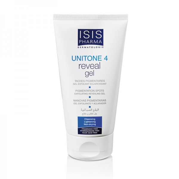 Unitone 4 reveal Gel Exfoliant Eclaircissant moussant Unitone 4 reveal Gel nettoie et exfolie le visage et lui donne une sensation immédiate de fraîcheur et de clarté. Son complexe de 4 actifs agit sur la surproduction de mélanine et éliminine la mélanine préformée à la surface de la peau.